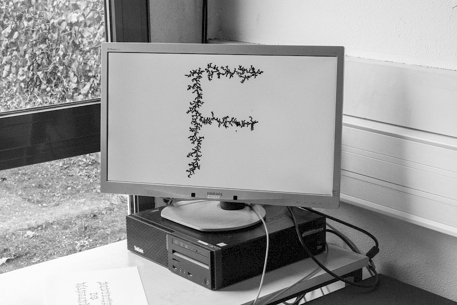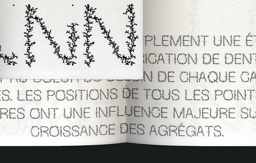 DLA est un jeu de caractère dessiné à l'aide d'un outil programmé en JavaScript qui imite un processus présent dans le milieu naturel : la diffusion limitée par aggregation. Le squelette d'Helvetica Neue Light - aéré et relativement lisible -, a été utilisé pour guider les dessins, ainsi l'essence de la DLA se trouve dans les détails formés par les particules : les ramifications, les amats, les raccourcis etc... Ce projet sera sûrement enrichie plus tard par de nouveaux styles dépendant des paramètres de la fonction de dessin.