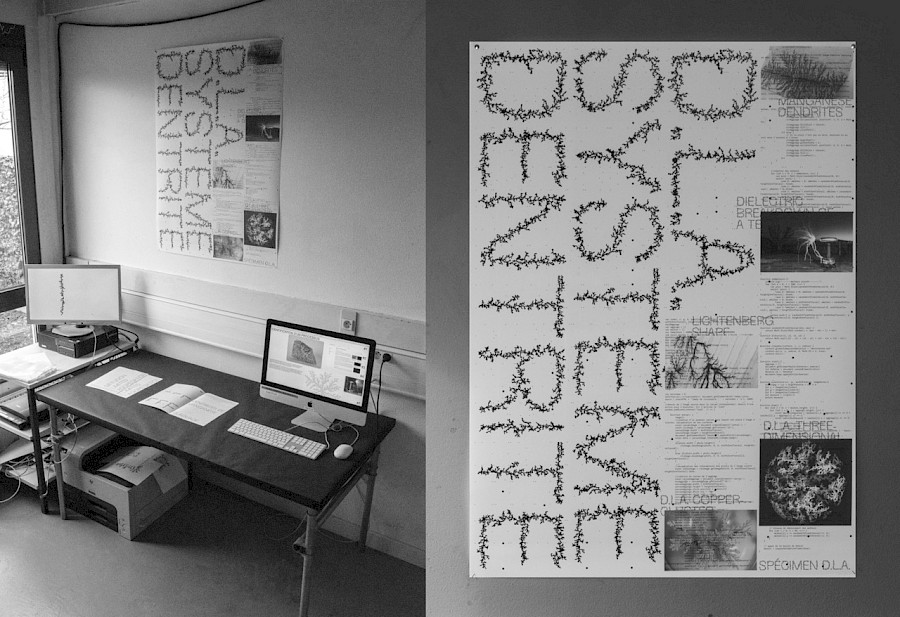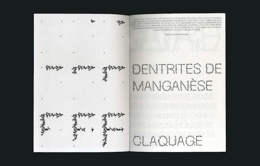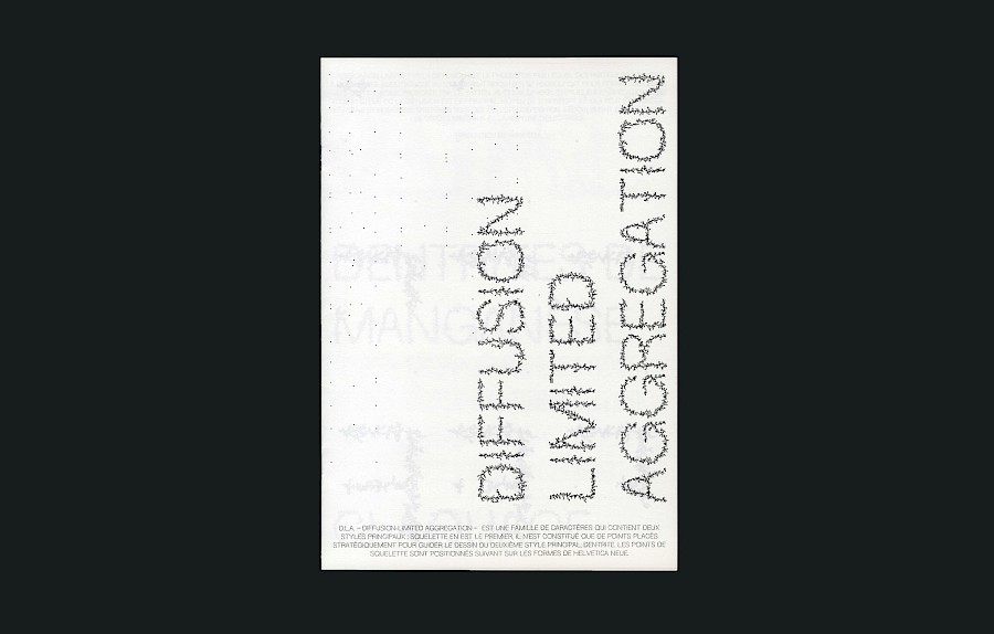 DLA est un jeu de caractère dessiné à l'aide d'un outil programmé en JavaScript qui imite un processus présent dans le milieu naturel : la diffusion limitée par aggregation. Le squelette d'Helvetica Neue Light - aéré et relativement lisible -, a été utilisé pour guider les dessins, ainsi l'essence de la DLA se trouve dans les détails formés par les particules : les ramifications, les amats, les raccourcis etc... Ce projet sera sûrement enrichie plus tard par de nouveaux styles dépendant des paramètres de la fonction de dessin.