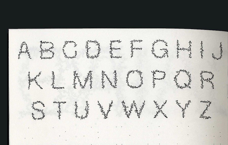 DLA est un jeu de caractère dessiné à l'aide d'un outil programmé en JavaScript qui imite un processus présent dans le milieu naturel : la diffusion limitée par aggregation. Le squelette d'Helvetica Neue Light - aéré et relativement lisible -, a été utilisé pour guider les dessins, ainsi l'essence de la DLA se trouve dans les détails formés par les particules : les ramifications, les amats, les raccourcis etc... Ce projet sera sûrement enrichie plus tard par de nouveaux styles dépendant des paramètres de la fonction de dessin.
